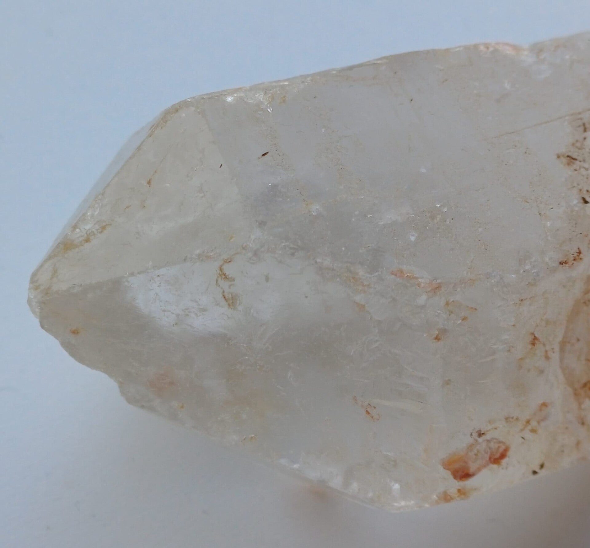 Ruwe en onbewerkte* Bergkristal punt. Ideaal om zelf mee aan de slag te gaan (bijvoorbeeld polijsten, lapidarie) of gewoon te bewonderen, zoals de natuur het afgegeven heeft. Bevat insluitsels van ijzeroxiden, welke ontstaan zijn door een waterrijke omgeving waarin de kristallen 'gegroeid' zijn. ;)